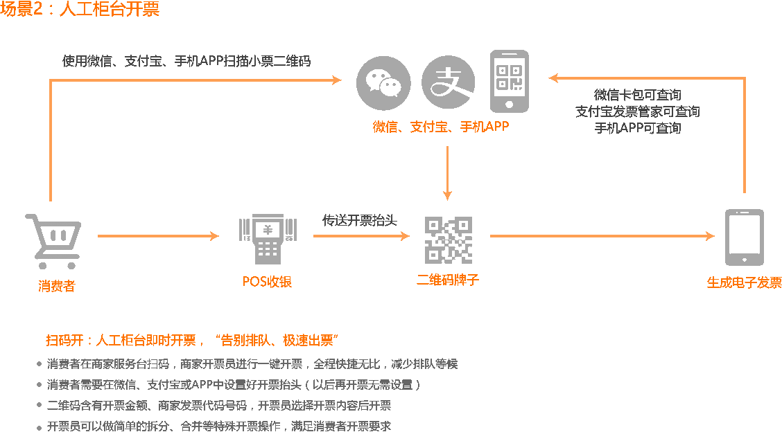 無縫自動開具電子發票服務,節約企業人力、時間成本,提高工作效率減少差錯。消費即開即獲取電子發票,不用等待,易保存,不易丟失,提升消費者體驗。